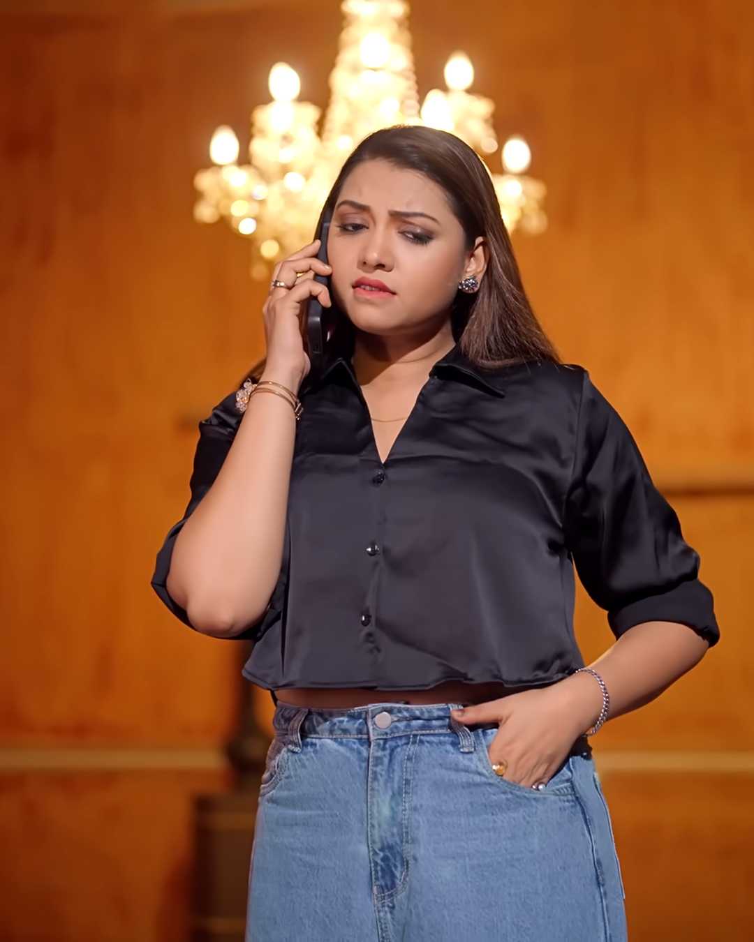 1. फोन पर बात करते हुए चिंतित लुक, ब्लैक साटन क्रॉप टॉप में लग्जरी चांडेलियर वाले कमरे में स्टाइलिश अंदाज़।