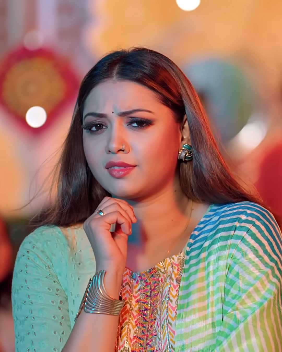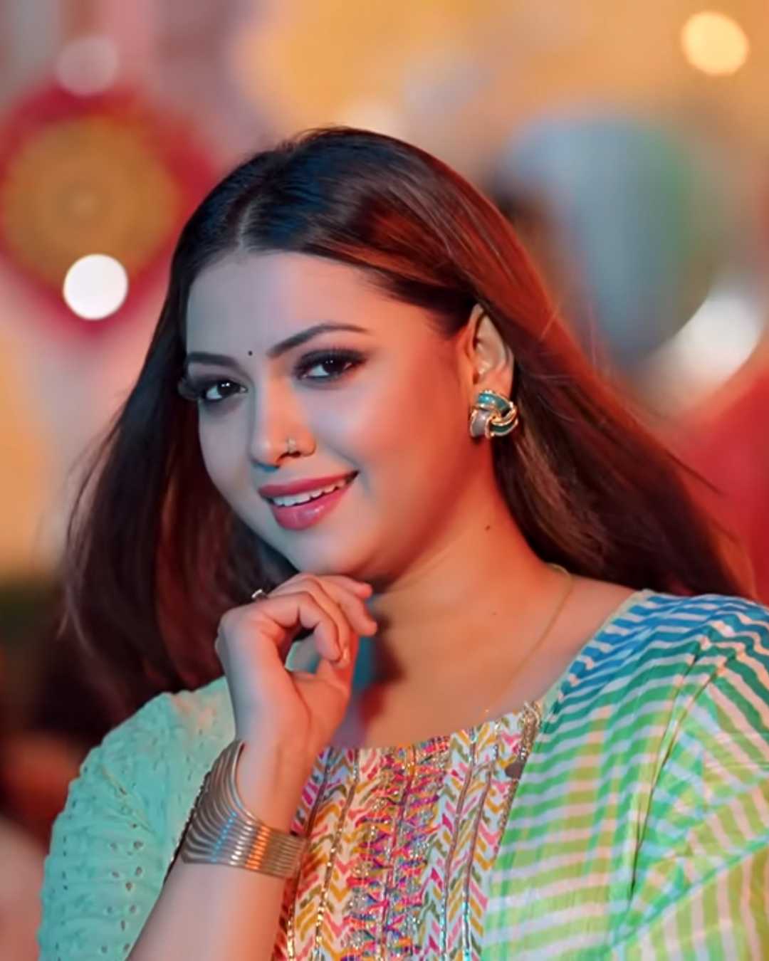 2. हरे-नीले स्ट्राइप्ड कुर्ते में खूबसूरत स्माइल, भारी ज्वेलरी और बिंदी के साथ उत्सव का माहौल।