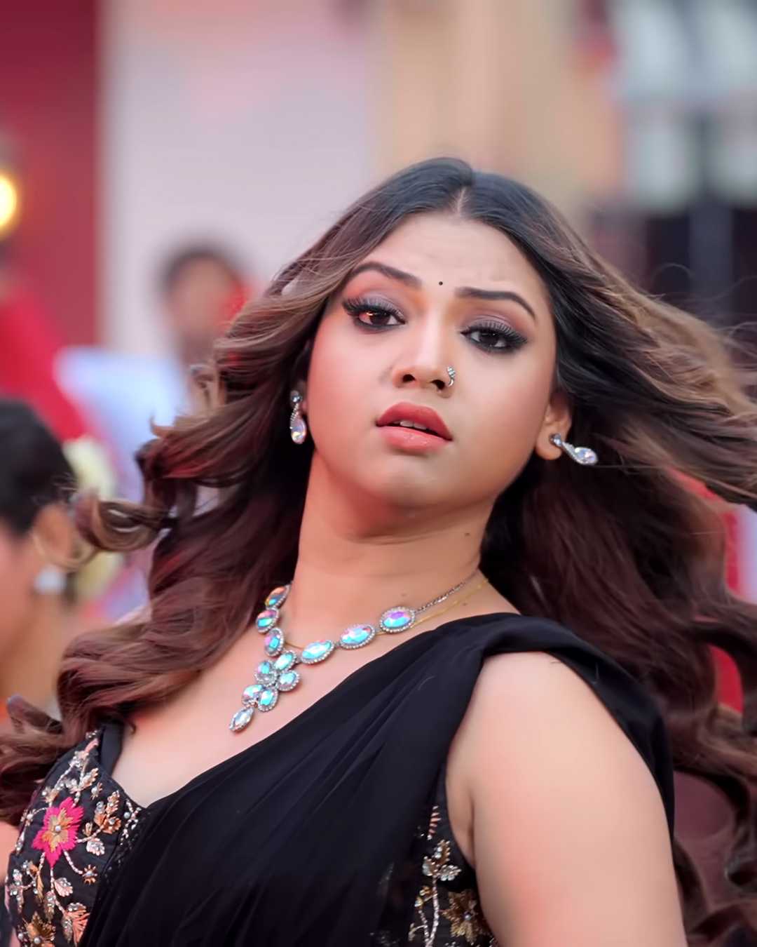 3. रेड-कार्पेट लुक – काली साड़ी में ओपल ज्वेलरी, बोल्ड मेकअप और लहराते बालों के साथ ड्रामैटिक पोज़