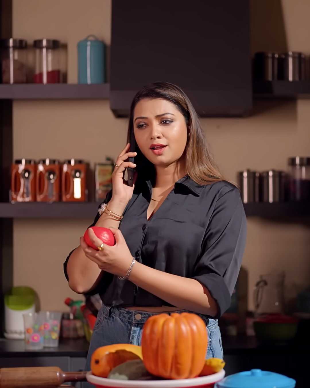 5. किचन में लाल सेब हाथ में लिए फोन पर बात, काली शर्ट और जींस में कैजुअल वाइब, सब्ज़ियाँ और कद्दू के साथ।