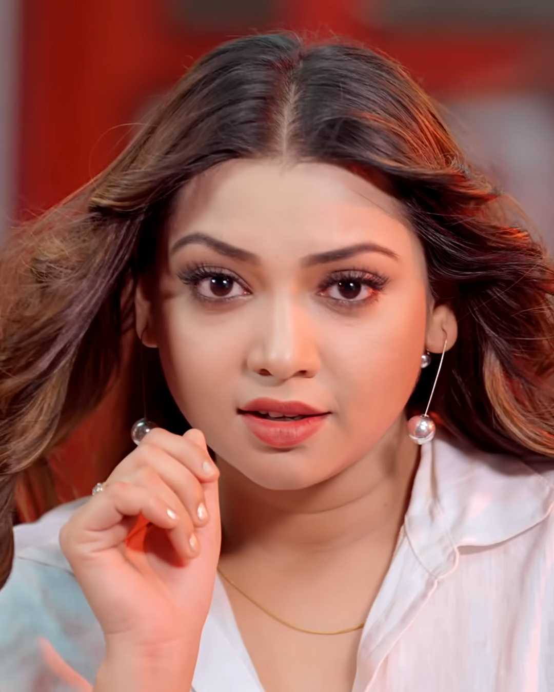 6. रंग-बिरंगे एम्ब्रॉयडर्ड कुर्ते में हाथ ठोड़ी पर, गर्मजोशी भरी मुस्कान और स्टेटमेंट ईयररिंग्स के साथ क्लोज़-अप।